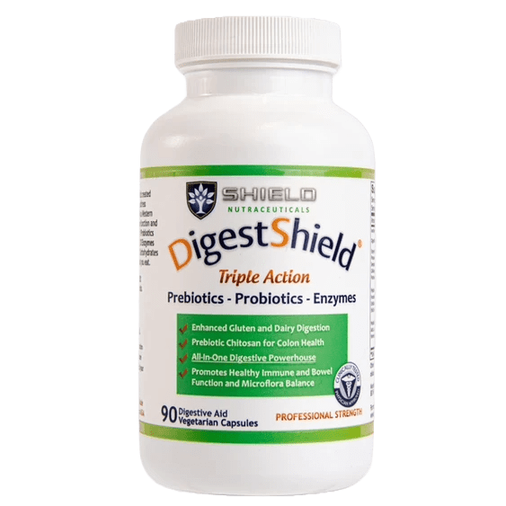 DigestShield® employs a triple action formula to help digest gluten, dairy, fat, carbohydrates and protein, better! Twenty plant-based enzymes help the body break down hard-to-digest foods into small, usable parts, delivering nutritional value from what we eat. This can help prevent diet-related immune responses. Eleven probiotics work to restore and maintain balance to gut microflora. Five prebiotics shield against the harmful effects of lectins while simultaneously feeding the probiotics in our formula.