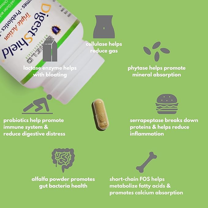 DigestShield® addresses dietary discomforts such as bloating, GERD, indigestion, gut pain, irregularity, fatigue, brain fog and more, caused by what you eat.
