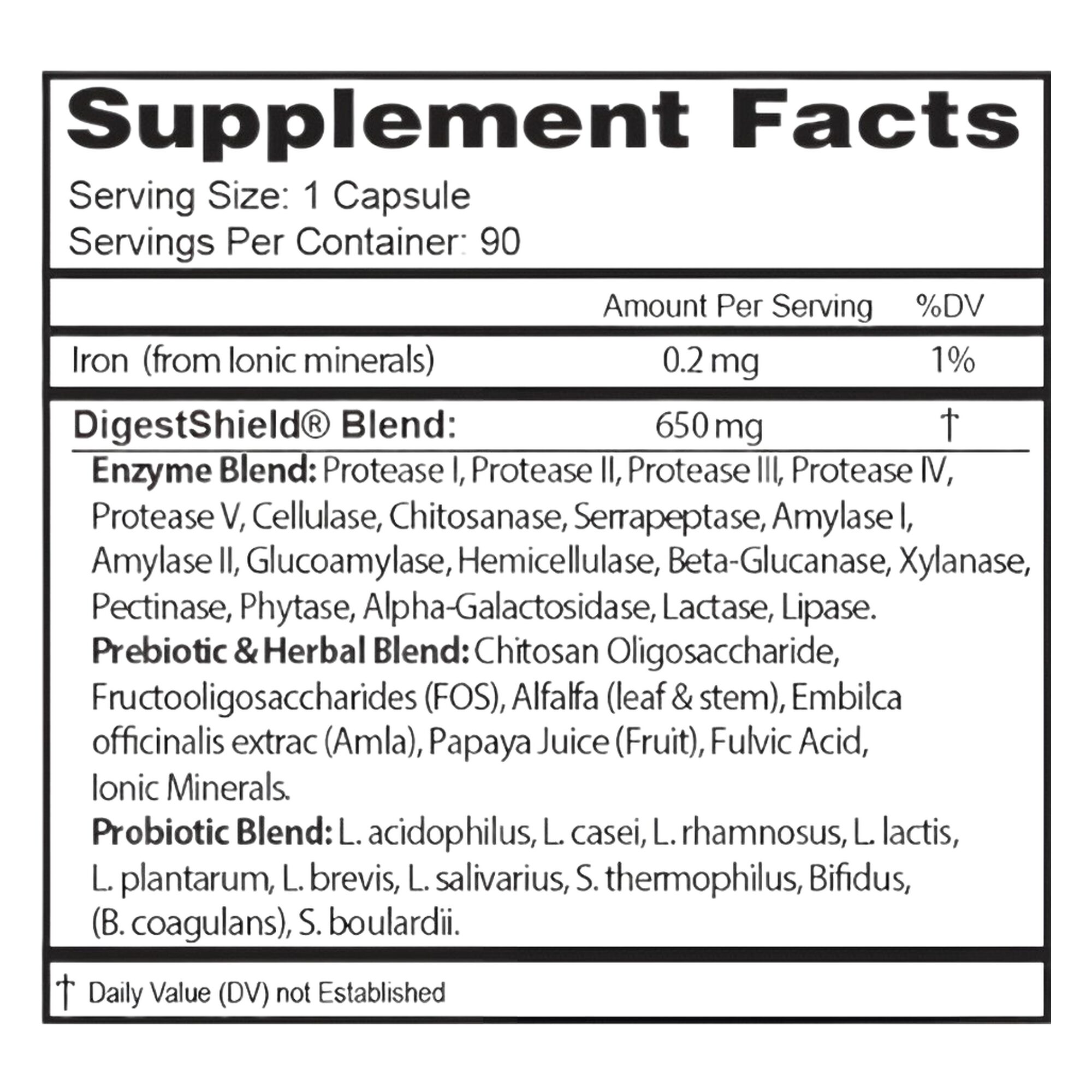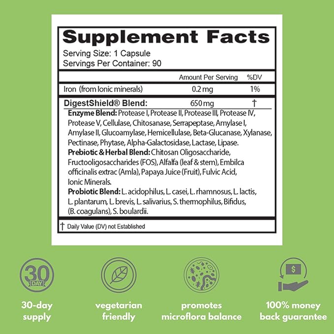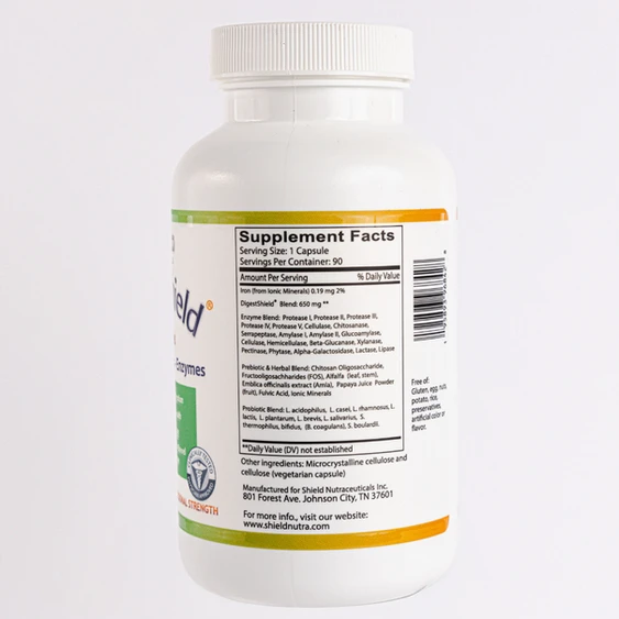 DigestShield® contains 5 prebiotics, 11 probiotics, and 20 enzymes, plus chitosan, all in one capsule.
